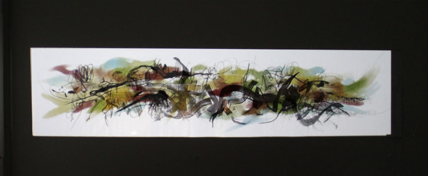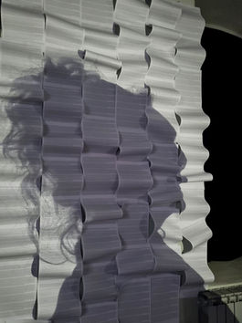 The drawing is not shown in a conventional way ie. it is wrapped behind a veil of transparent white fabric, backlit, transforming it into something more than just a drawing on paper, creating an enigmatic aura, an essence that floats between the world of the real and the surreal.